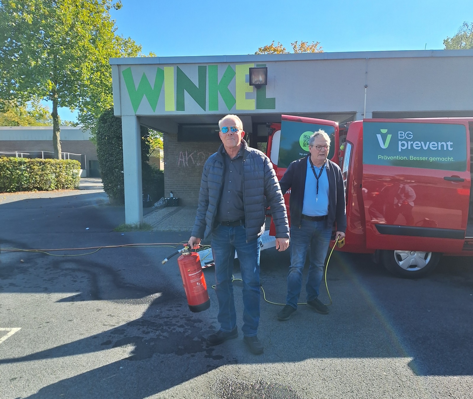 Einige Lehrerinnen der Grundschule am Kehlbach, die Sekretärin des Standortes Everswinkel und die Sekretärinnen der Verbundschule sowie Hausmeister Frank Schiller nahmen am 1. Oktober 2025 an der Brandschutzhelferschulung der BG prevent am Standort der Grundschule in Everswinkel teil.