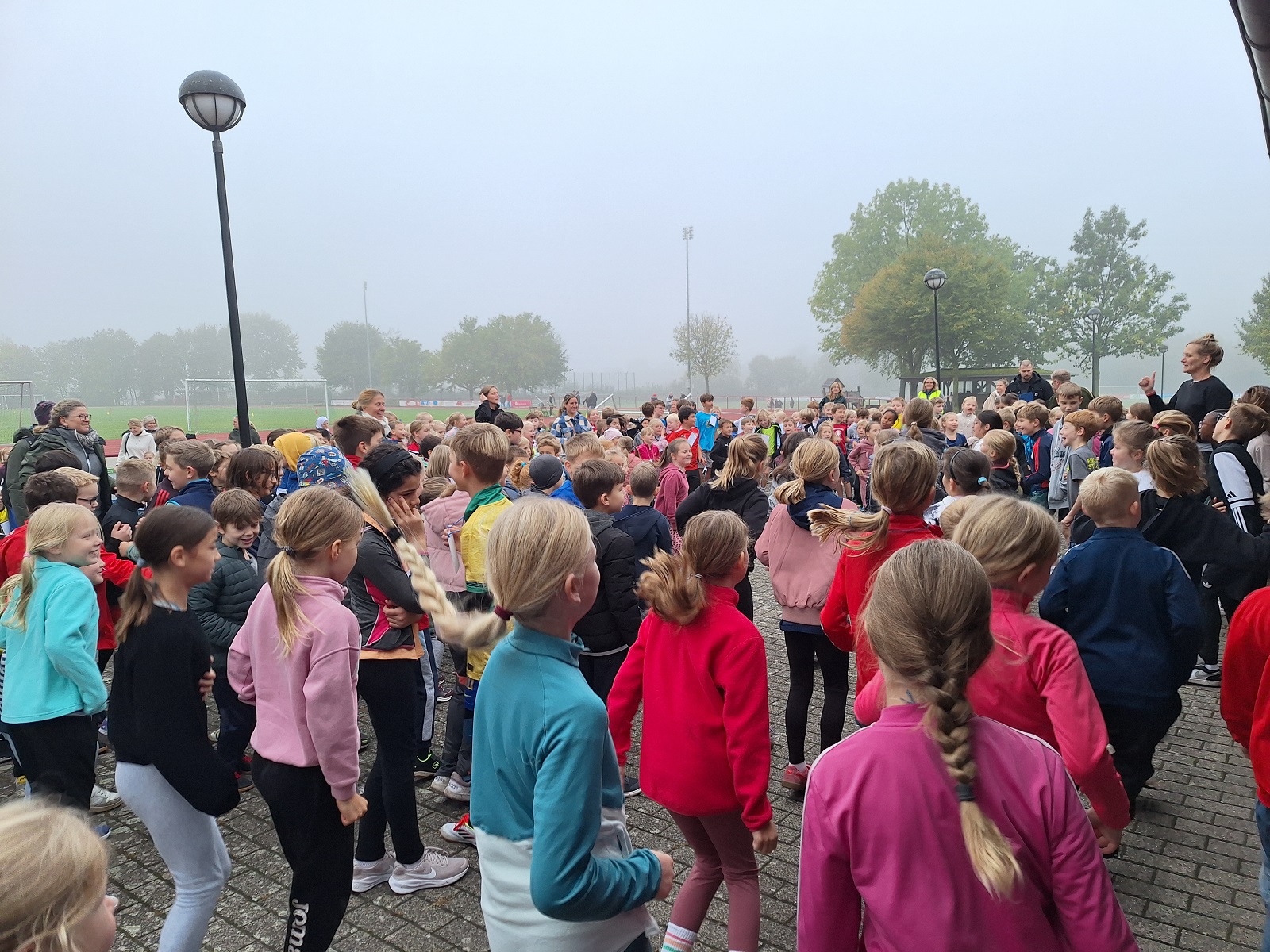Im morgendlichen Herbstnebel bauten einige Lehrerinnen und Eltern die Sportstationen zum Laufen, Werfen und Springen auf.